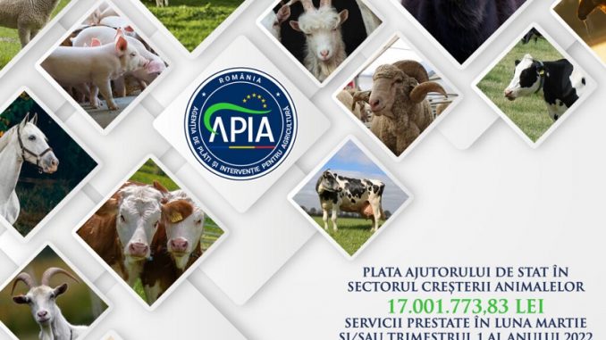 Agenția de Plăți şi Intervenție pentru Agricultură (APIA) efectuează prin Centrele Județene plata ajutorului de stat în sectorul creșterii animalelor, solicitat prin cererile de plată aferente serviciilor prestate în luna martie și/sau trimestrul I al anului 2022, în funcție de opțiunea asociațiilor exprimată în cererea inițială.