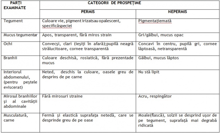 3. În cazul produselor pescăreşti preparate (fileuri, rondele, trunchiuri de pește etc) trebuie să prezinte culoarea, fermitatea şi mirosul specific din care provin, nefiind admisă expunerea și comercializarea fileurilor, rondelelor sau bucăţilor de peşte care prezintă o culoare a cărnii modificată sau miros modificat (de acru, amoniacal, de putred etc) şi o consistenţă a cărnii moale, flască (la apăsare degetul pătrunde cu uşurinţă în carnea peştelui, amprenta de apăsare rămâne evidentă).