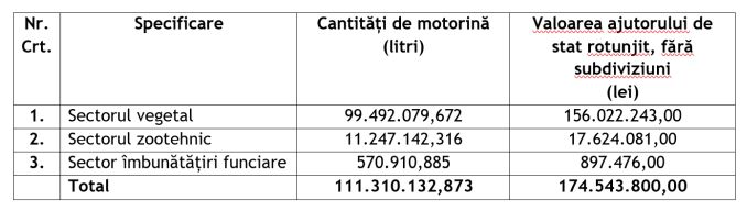 Valoarea ajutorului de stat acordat sub formă de rambursare care urmează a fi plătită este de 174.543.800,00 lei pentru un număr de 17.181 beneficiari cu cantitățile de motorină determinate cu acciza redusă de 111.310.132,873 litri.
