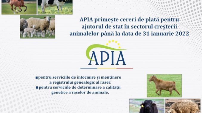 Agenția de Plăți şi Intervenție pentru Agricultură (APIA) informează că, până la data 31 ianuarie 2022 inclusiv, se depun cererile de plată pentru ajutorul de stat în sectorul creşterii animalelor, aferent serviciilor prestate în luna decembrie și în trimestrul al IV-lea al anului 2021.