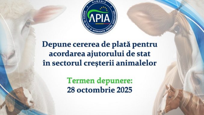 Agenția de Plăți și Intervenție pentru Agricultură (APIA) reamintește beneficiarilor că, până la data de 28 octombrie 2025, primește Cererile de plată pentru acordarea ajutorului de stat în sectorul creșterii animalelor, aferente activității din luna septembrie și trimestrul III al anului 2025.