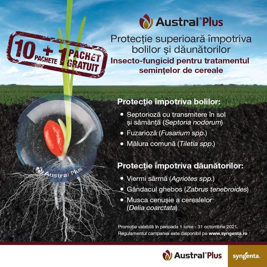 Austral® Plus este insecto-fungicidul ready-mix cu un spectru larg de boli combătute și dăunători controlați: în culturile de grâu: fuzarioza (Fusarium spp.), mucegaiul de zăpadă (Microdochium nivale), septorioza cu transmitere în sol şi sămânţă (Septoria nodorum), Tilletia spp., viermii sârmă (Agriotes spp.), gândacul ghebos (Zabrus tenebrioides); în culturile de orz: tăciunele orzului (Ustilago hordei), sfâşierea frunzelor cu transmitere în sol şi sămânţă (Pyrenophora graminea), fuzarioza (Fusarium culmorum), mucegaiul de zăpadă (Microdochium nivale), viermii sârmă (Agriotes spp.), gândacul ghebos (Zabrus tenebrioides).