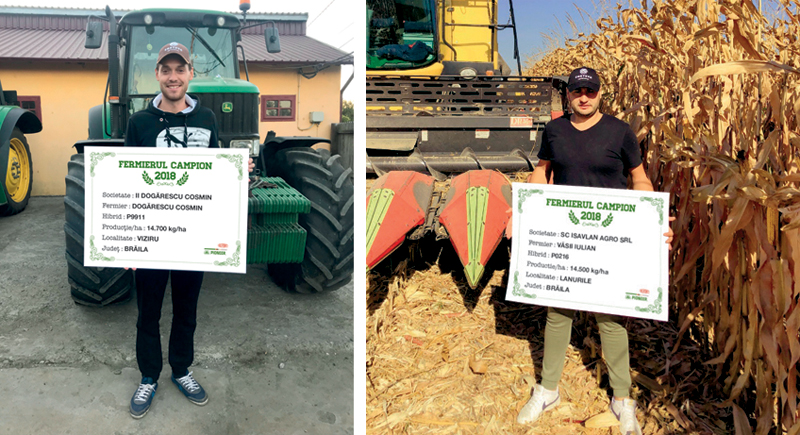 Primul fermier campion din județul Brăila este Cosmin Dogărescu, care lucrează 300 ha, iar anul trecut a avut porumb pe 130 ha. A obținut 14.700 kg/ha cu hibridul P9911 și 14.500 kg/ha cu hibridul P0023. “Am semănat anul trecut 30 ha cu porumb după soia, iar pe 100 ha am avut monocultură. În toamnă am arat, în primăvară am efectuat două treceri cu combinatorul. Am semănat 82.000 b.g/ha în a doua jumătate a lunii aprilie, atunci când am aplicat și 230 kg/ha de îngrășământ complex 16.16.16. Am aplicat două erbicide în vegetație, primul în faza de 2-4 frunze, iar cel de al doilea în 6 frunze. Am prășit atunci când plantele aveau 8-10 frunze și am aplicat azot – 200 kg/ha. Cultura a fost în irigat, a primit două tranșe de apă, iar recoltatul a avut loc începând cu prima parte a lunii octombrie. În acest an voi semăna porumb pe 160 ha și am ales hibrizii P9911, P0023, P0217 și un hibrid nou. Pot spune că am avut o producție foarte bună anul trecut și o cultură fără probleme”, a declarat fermierul campion.