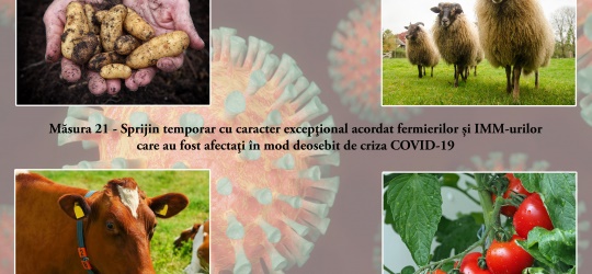 Agenția de Plăți și Intervenție pentru Agricultură (APIA), informează că, în data de 23 octombrie 2020, s-a încheiat procesul de depunere a cererilor în cadrul Măsurii 21 – Sprijin temporar cu caracter excepțional acordat fermierilor și IMM-urilor care au fost afectați în mod deosebit de criza COVID-19, din Programul Național de Dezvoltare Rurală (PNDR) 2014 – 2020, respectiv în sectorul zootehnic – bovine, sectorul zootehnic – ovine