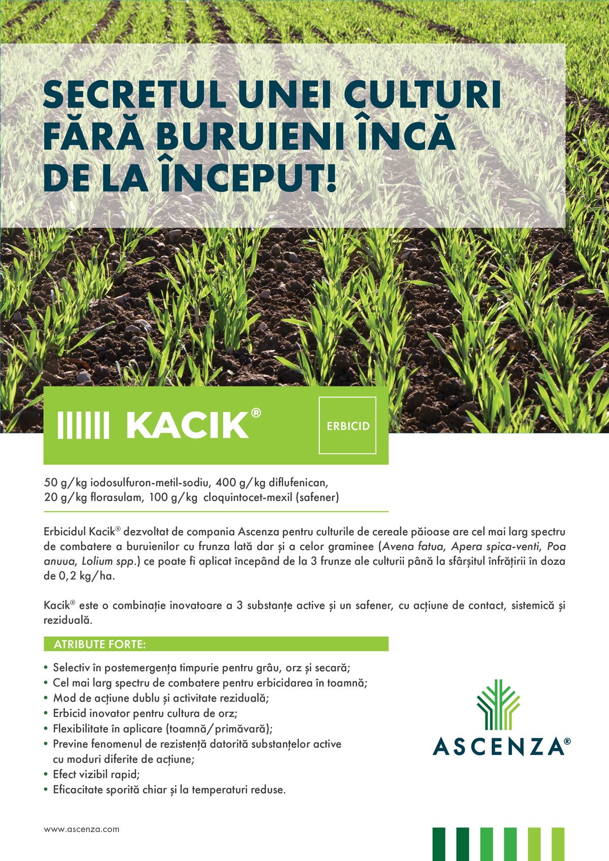 Erbicidul Kacik® dezvoltat de compania Ascenza este un produs recomandat pentru combaterea în postemergență a buruienilor graminee şi a celor cu frunza lată din culturile de cereale păioase – grâu, orz și secară.