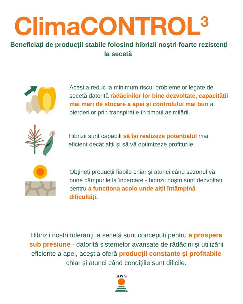 În plus față de hibrizii de înaltă performanță, portofoliul KWS include și hibrizi concepuți să se dezvolte în condiții mai secetoase. Sub numele de ClimaCONTROL3, acești hibrizi prezintă:
