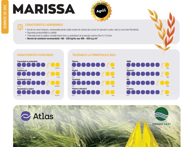 Pentru cei care vor semăna orz în campania de toamnă, Agrii România are în portofoliul de semințe Atlas, soiul Marissa, un soi semi-timpuriu, genetică Donau Saat.