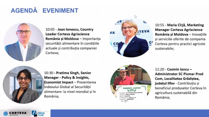 Lectorii conferinței au fost: JEAN IONESCU – Country Leader Corteva Agriscience România și Moldova, MARIA CÎRJĂ – Marketing Manager Corteva Agriscience România și Moldova, PRATIMA SINGH – Senior Manager – Policy & Insights, Economist Impact COSMIN IANCU – Administrator SC Picmar Prod Com, Localitatea Grădiștea, Județul Ilfov.