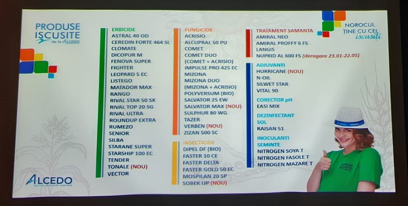 Noutățile din portofoliul iscusit de produse Alcedo prezentate fermierilor au fost: erbicidul Tonale, insecticidul Sobek, fungicidele Acrisio, Salvator Max, Verben, adjuvantul Hurricane, fertilizanții și biostimulatorii YaraMila, YaraVita și Unibore.