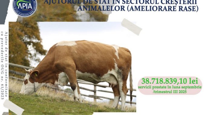 Agenția de Plăți şi Intervenție pentru Agricultură (APIA), prin intermediul Centrelor Județene, efectuează plata ajutorului de stat în sectorul creșterii animalelor (ameliorare rase), solicitat prin cererile de plată aferente serviciilor prestate în luna septembrie / trimestrul III 2025.